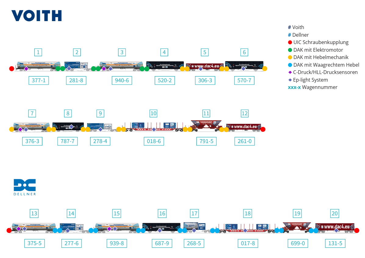 Für die Phase II wurde der DAC4EU-Demonstratorzug sukzessive auf 20 Wagen mit dem ausgewählten Scharfenberg- bzw. Latch Type Kupplungsdesign aufgerüstet. Dabei wurden drei neue Wagenarten hinzugefügt: